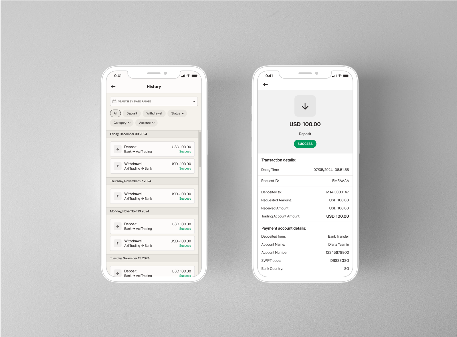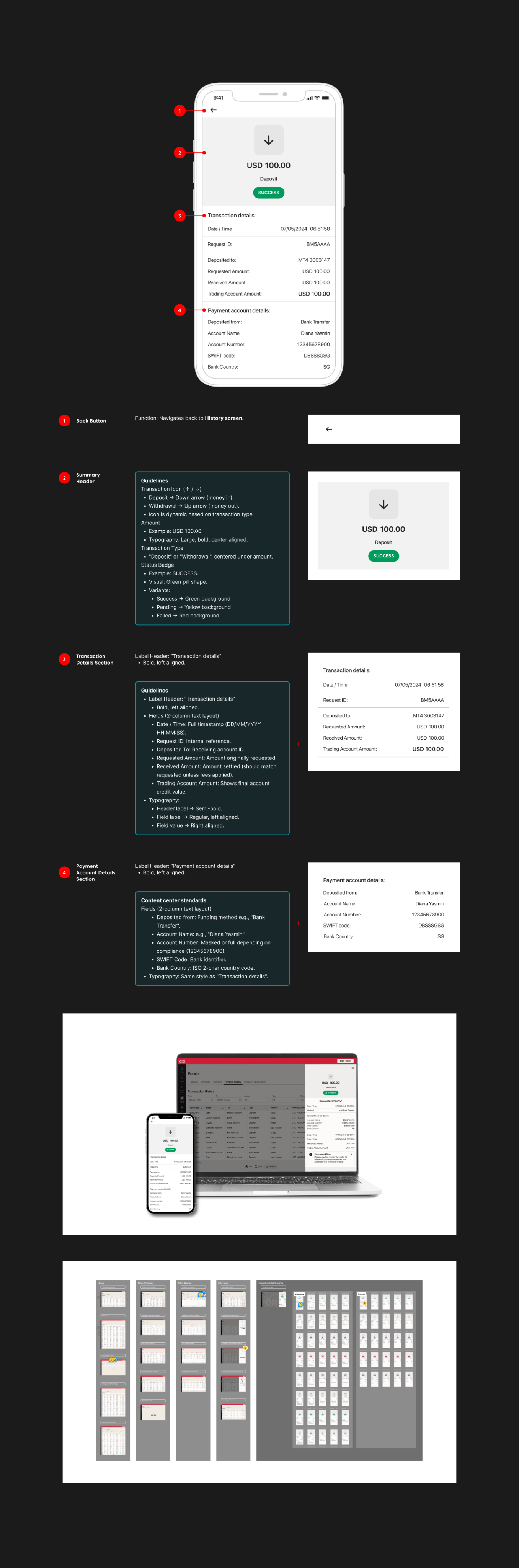 To tackle this, I crafted a sleek transaction history and details flow that prioritizes clarity and ease of use. The history screen features quick filters and a tidy overview of past actions, with a consistent layout and color-coded statuses for instant recognition. For added trust and transparency, the transaction details screen offers a comprehensive breakdown, including the amount, request ID, account details, and banking info. The outcome? A user experience that combines high-level clarity with detailed reassurance, cutting down support issues and boosting user confidence in their financial activities.