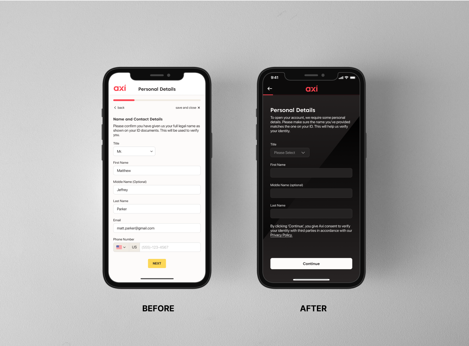 The old onboarding experience notably suffered from repetitive data entry for simple information, overly transactional copy that lacked warmth, no clear progress indicators, delayed exposure to the app’s value and inconsistent CTA buttons that were confusing users.